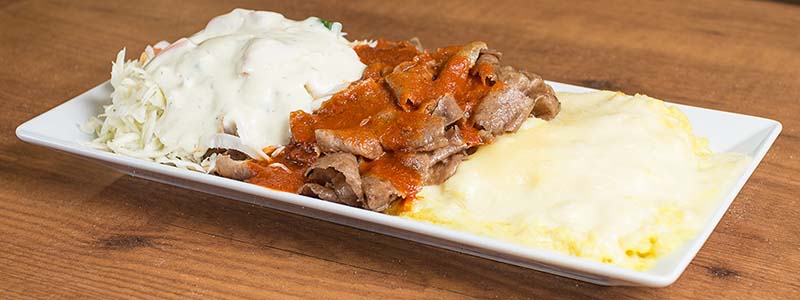 Juustoperunat, Kebabliha, Talon kastike, Salaatti ja Talon majoneesi