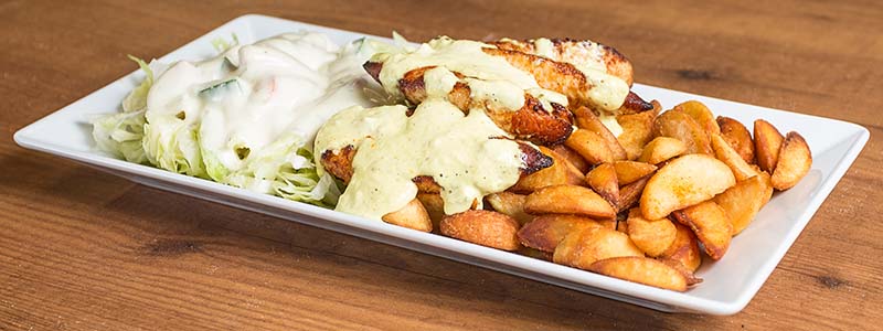 Kanan rintafile, Lohkoperunat, Salaatti, Curry-majoneesi ja Talon majoneesi
